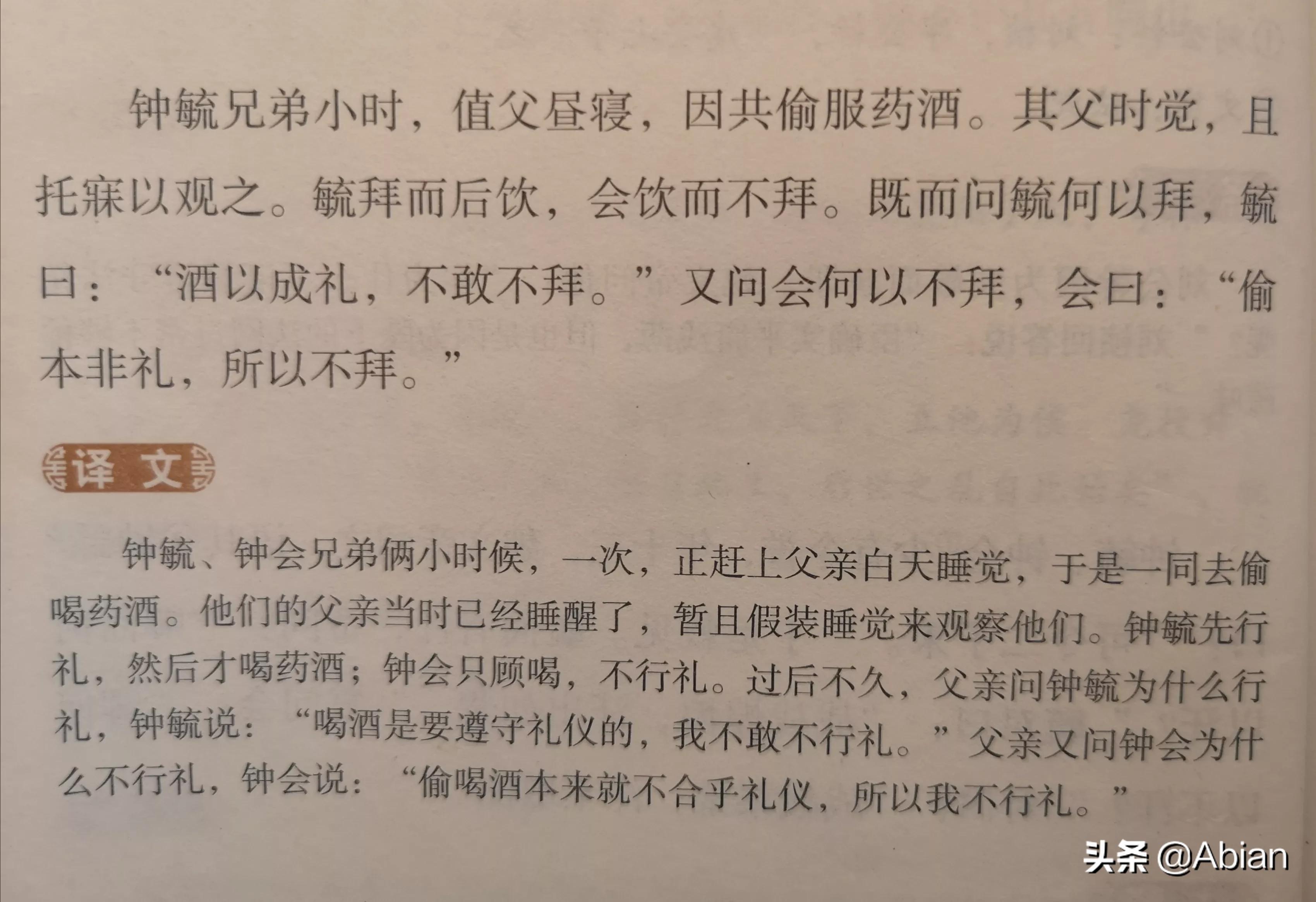 钟毓(yù)、钟会小时,值父昼寝,因共偷服药酒。其父时觉,且托寐(mèi)以观之。毓拜而后饮,会饮而不拜。既而问毓何以拜,毓曰:“酒以成礼,不敢不拜。”又问会何以不拜,会曰:“偷本非礼,所以不拜。”