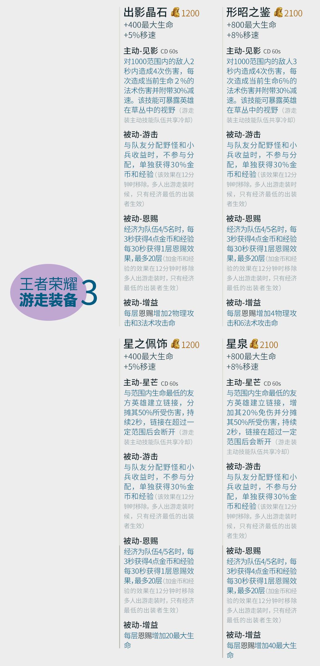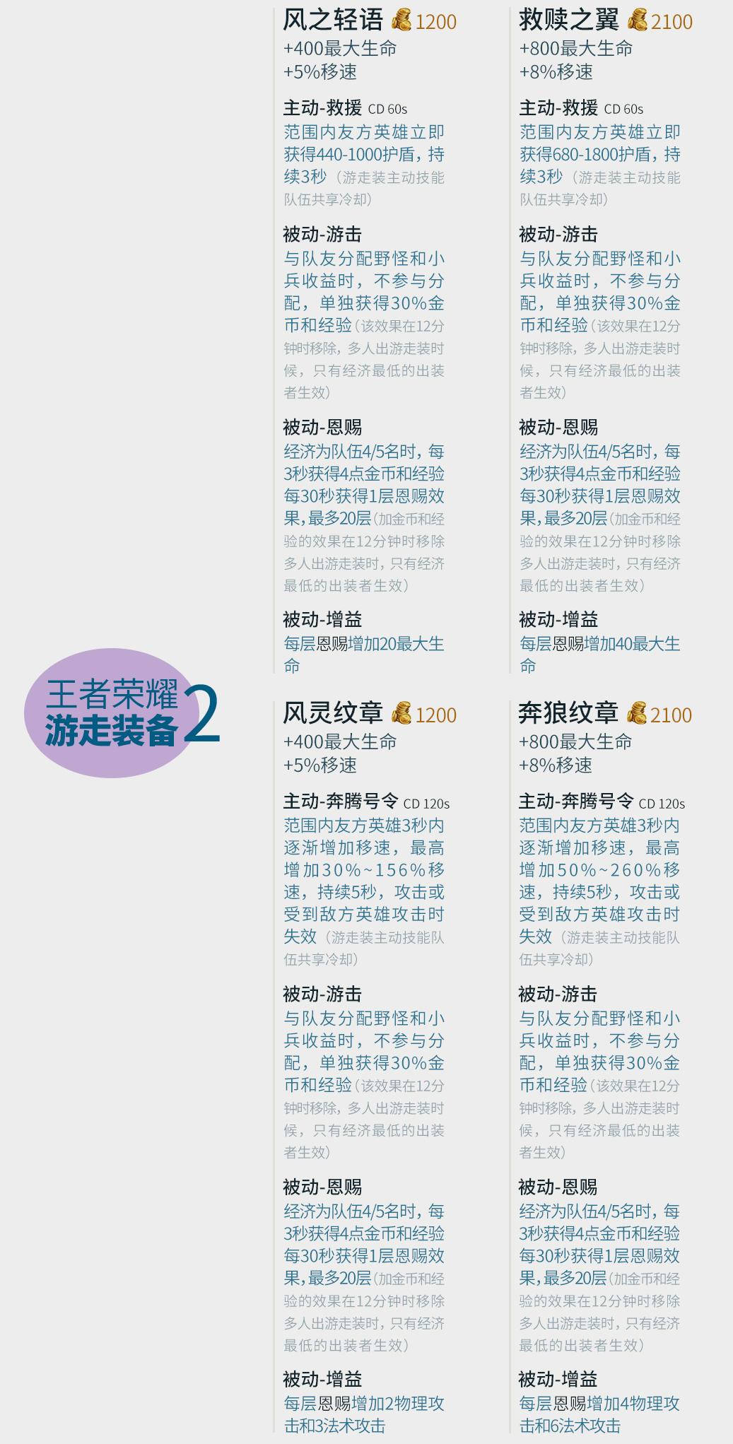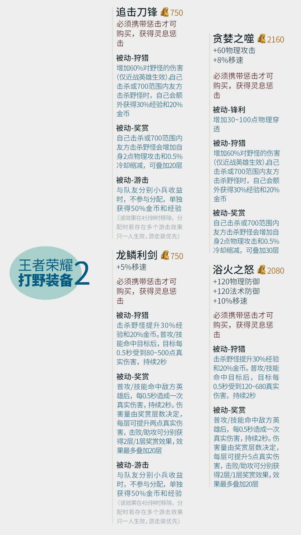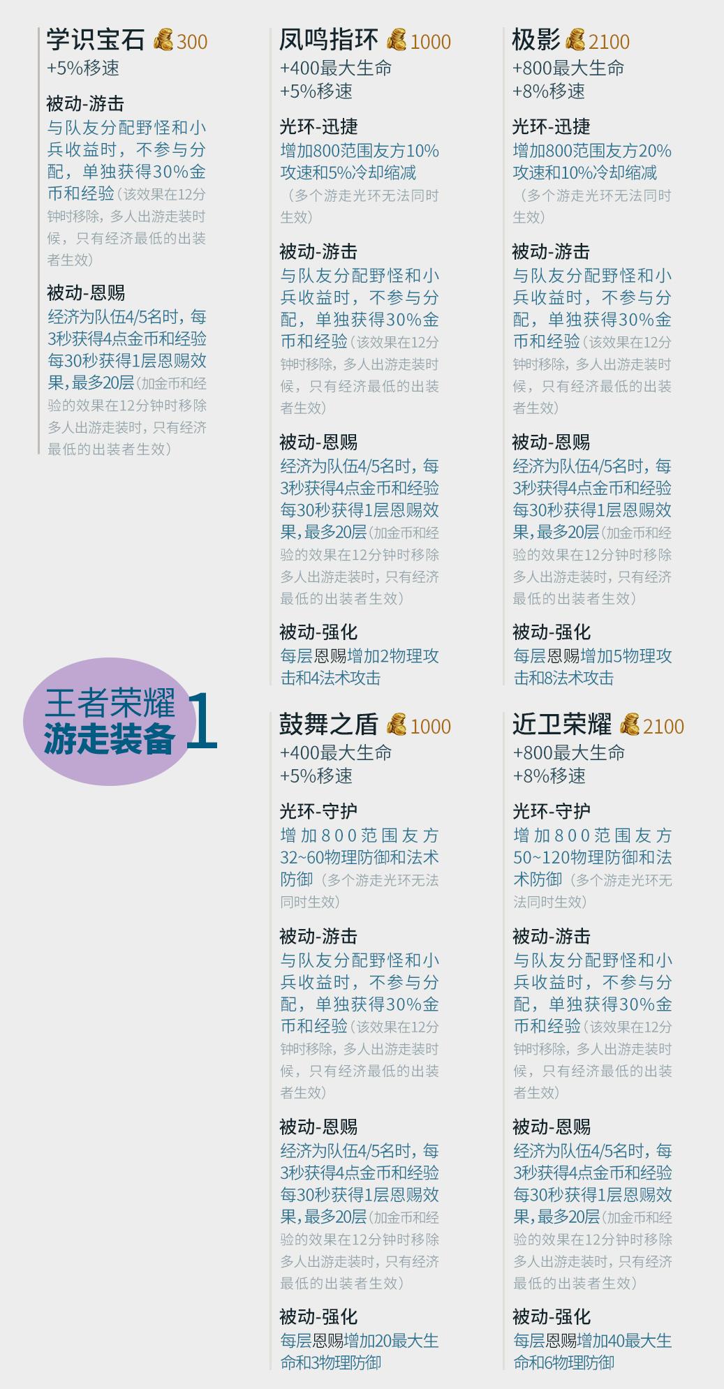 《王者荣耀》中的装备根据分类,有攻击、防御、法术、打野、移动、游走,以下便是各类别下的所有装备。(注:金币后的数字表示购买该装备所需要的花费)