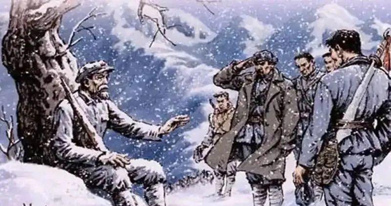 一九三五年长征途中,物资供应十分困难。时任军需处长的胡军,把棉衣分给了其他战士,自己却穿着单薄破旧的衣服。在爬雪山时终因不敌严寒而被冻僵,壮烈牺牲。