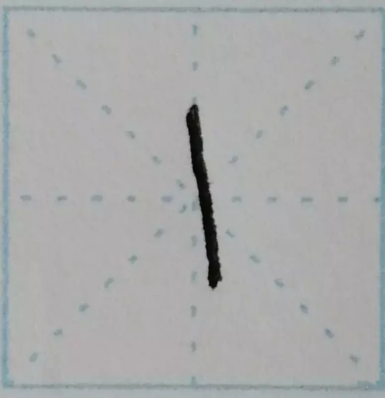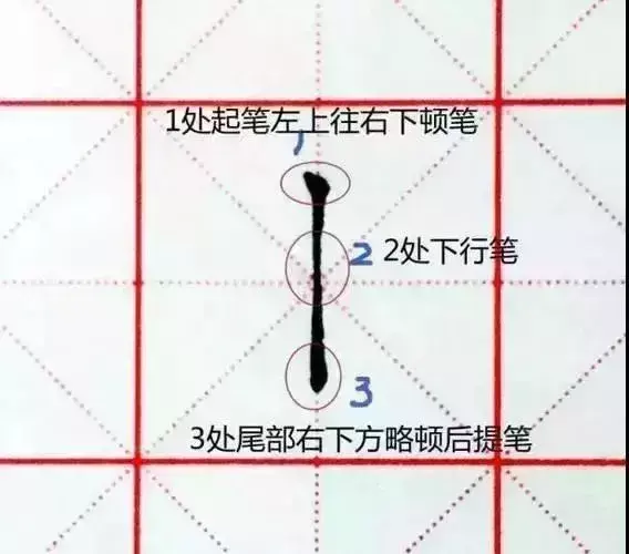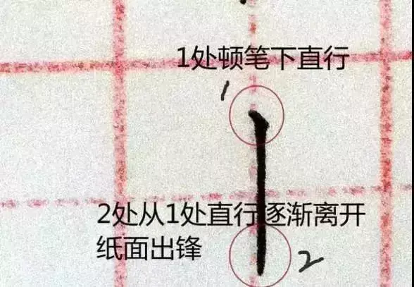 【要点】向右下方向落笔,稍按,转笔向下行笔,力量逐渐减轻,笔锋自然拖出,末尾像一根悬着的针,故叫“悬针”。注意锋尾不要写弯了。悬针一般用在字的中间。