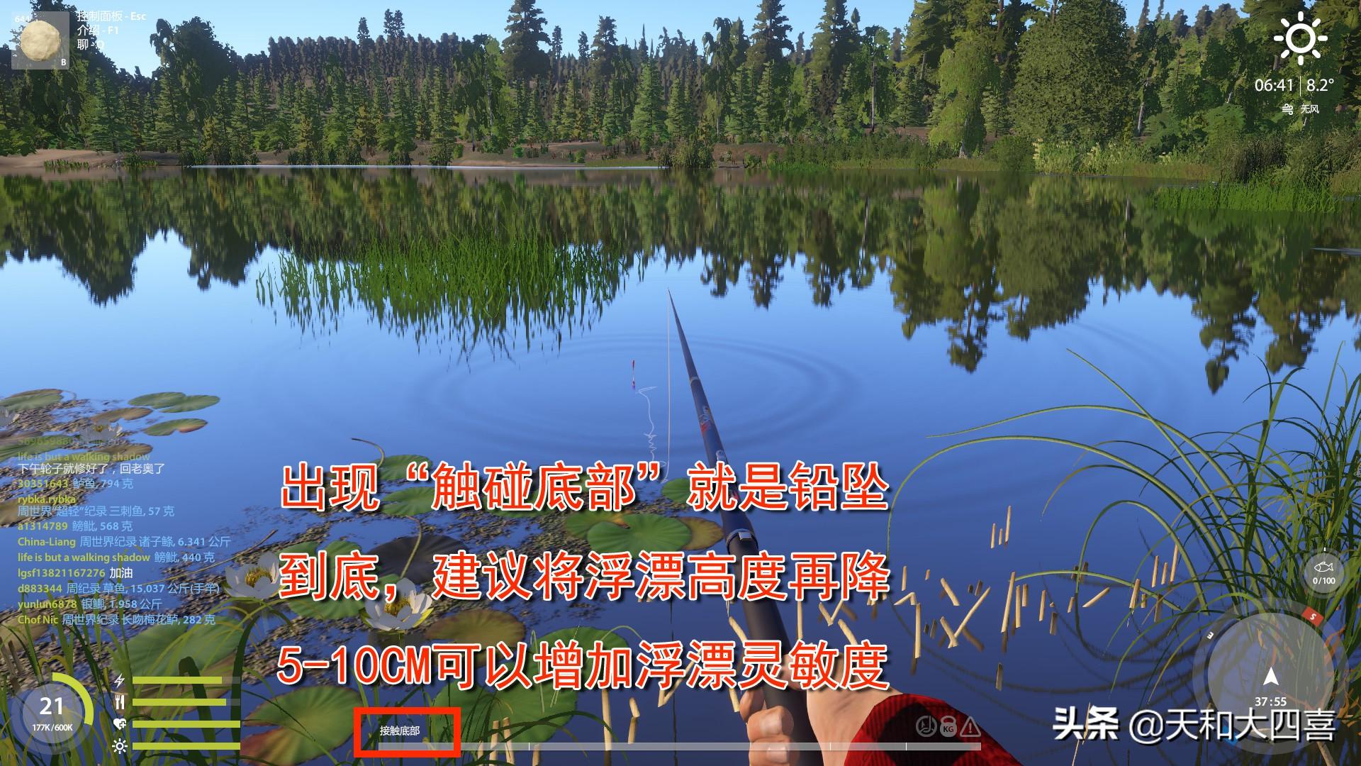 调整到位后屏幕下方会出现“触碰底部”这一信息,然后我们再将浮漂调低5-10CM。