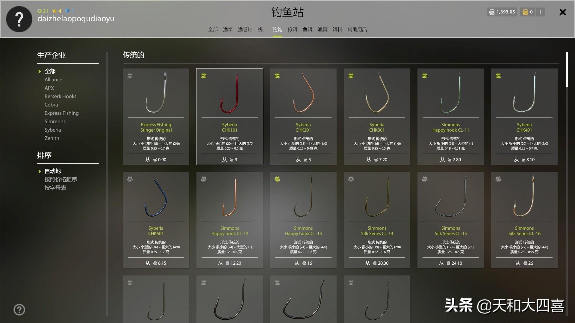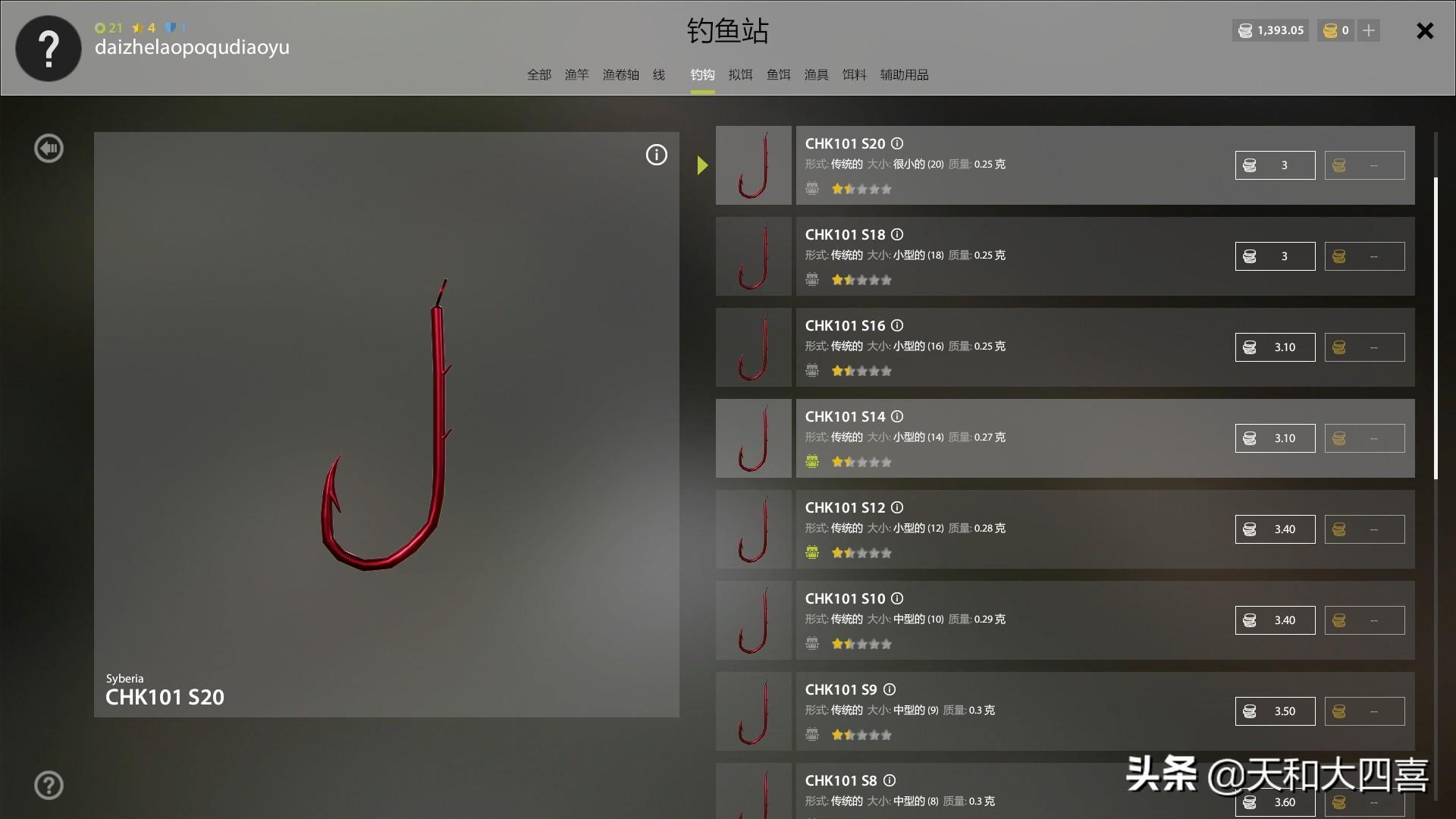 在渔具店进入鱼钩界面买第2款红色鱼钩。
