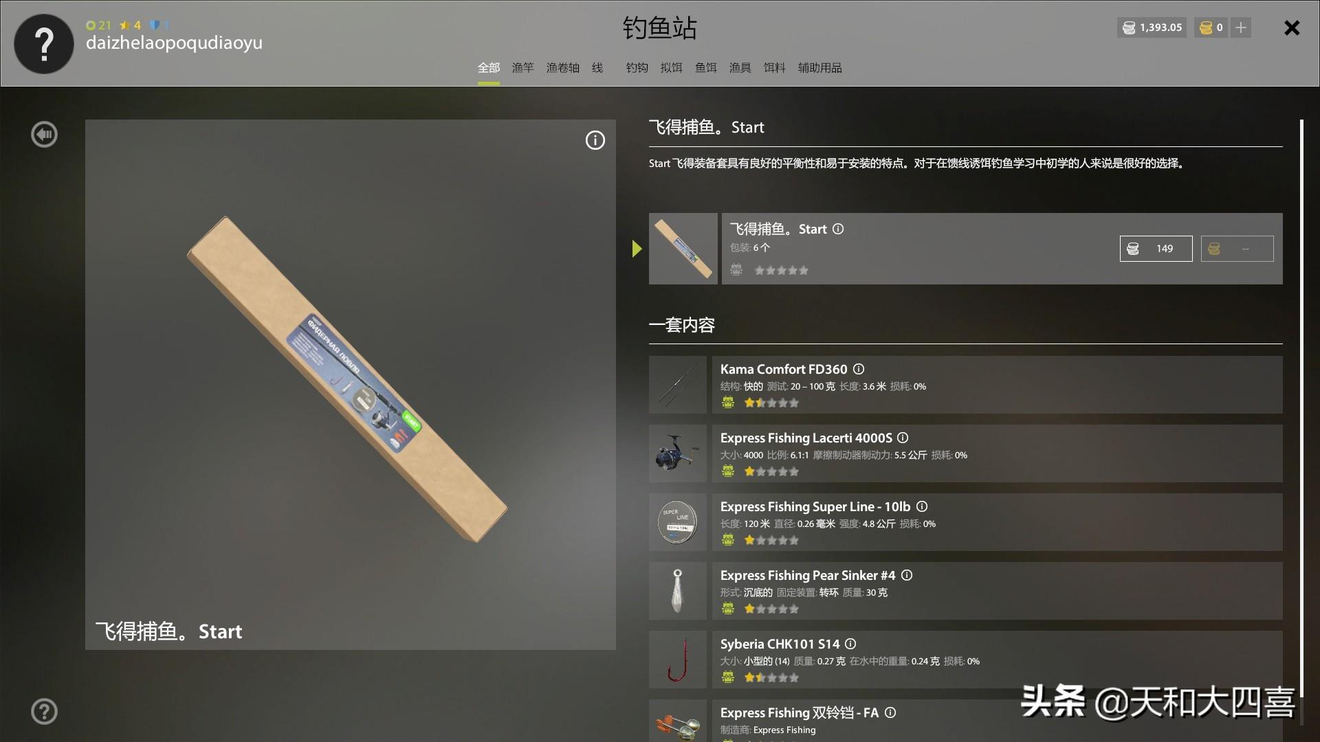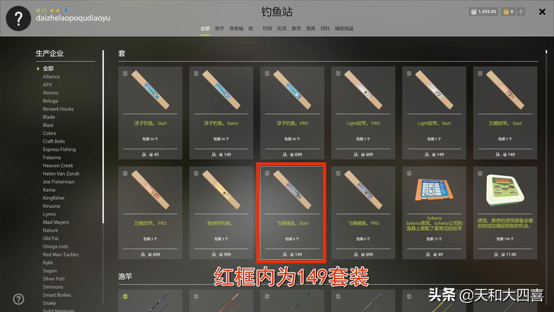 红框内就是149套装,是我们以后钓鱼的必需品,我们要攒钱买够3套149套装,注意要买149飞德套装,由于翻译问题,游戏中的飞德装备就是我们现实中的海竿钓鱼装备。