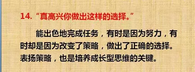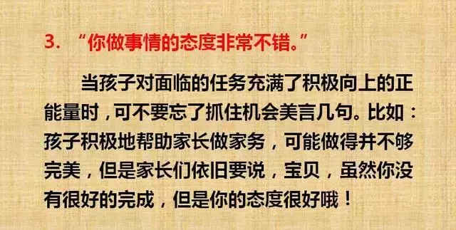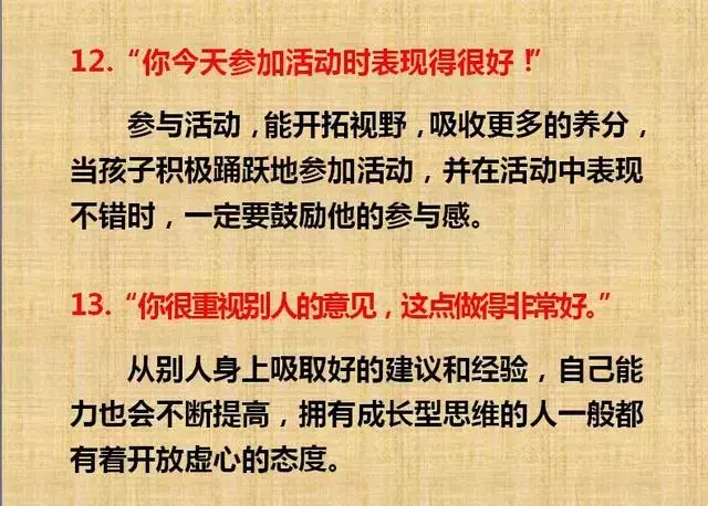 夸奖,即赞美、称赞。正确的夸奖孩子,一是需要以具体的事件和场景为基础,只有回归具体事件和具体场景,孩子才会真正意义上明确自己哪些行为是正确的。二是需要真诚,要出于真心,所夸奖的内容是对方确实具有或即将具有的优良品质和特点。三是夸奖的内容应被对方所在意。不要再夸孩子“你真棒!”了。如果家长们觉得找不到合适的语言来夸奖孩子,可以看看根据斯坦福大学Carol Dweck教授的成长型思维培养法制订的一个专门的“话术清单”。