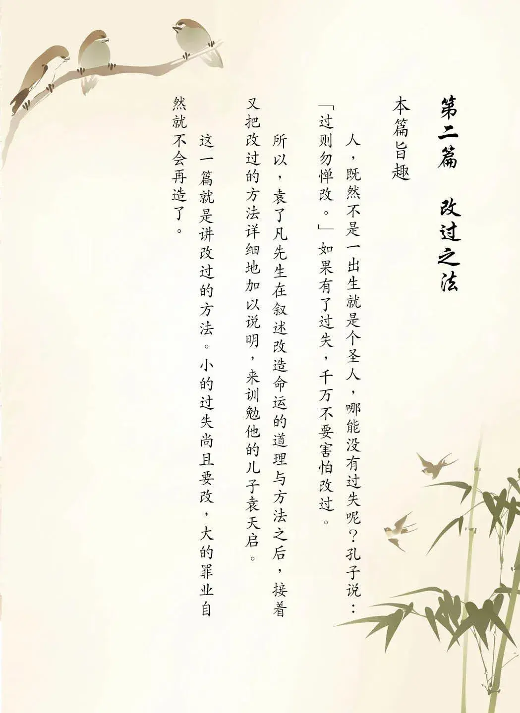 汝今既知非,将向来不发科第,及不生子之相,尽情改刷;务要积德,务要包荒,务要和爱,务要惜精神。从前种种,譬如昨日死;从后种种,譬如今日生。此义理再生之身也。