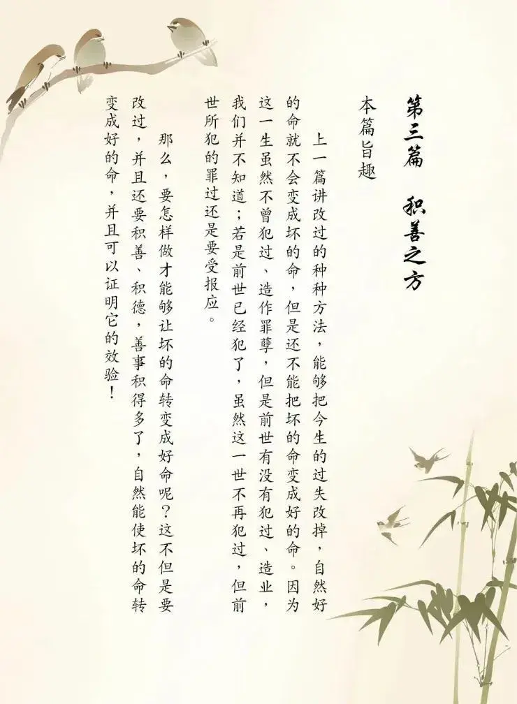 《易经》中替宅心仁厚的有德之士筹谋,专谈如何趋向吉祥、避开凶险的道理。如果说上天所订定的命运是永远固定、不可改变的,那么如何可以趋向吉祥,又哪里能够避开凶险呢?《易经·坤卦》上说:‘能够经常行善的家庭,必定会有多余的福报传给子孙。’你是否能信得过这个道理呢?”