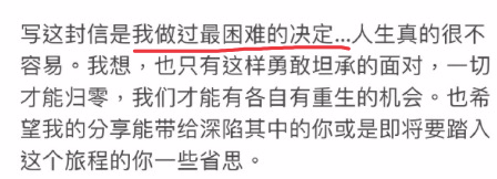 李靓蕾在微博中直言:我想,也只有这样勇敢坦承的面对,一切才能归零,我们才能有各自有重生的机会。也希望我的分享能带给深陷其中的你或是即将要踏入这个旅程的你一些省思。