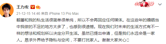 12月15日下午,王力宏宣布与李靓蕾离婚:决定分开生活,但永远会是一家人。