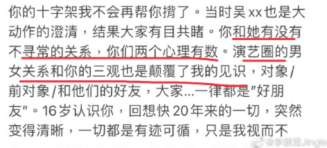 李靓蕾在文中甚至直接在信中提到了王力宏和某某女明星之间不寻常的关系,她直言道:演艺圈的男女关系和王力宏的三观也颠覆了我的见识。