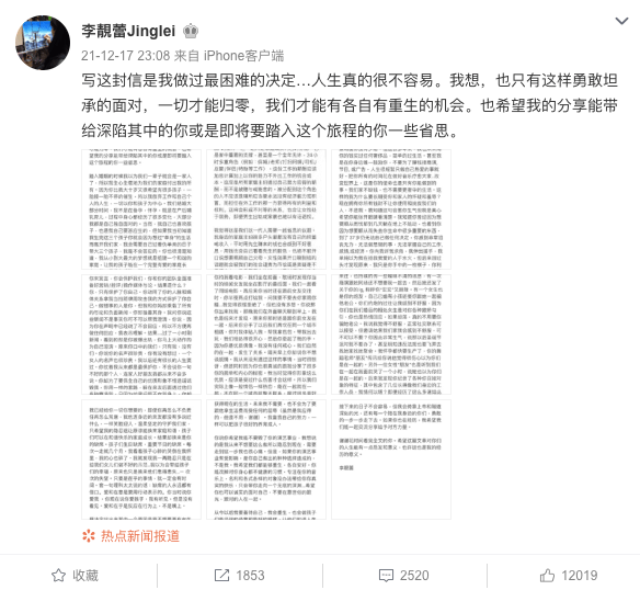李靓蕾在长信中写道,自己写这封信是做过最困的决定。