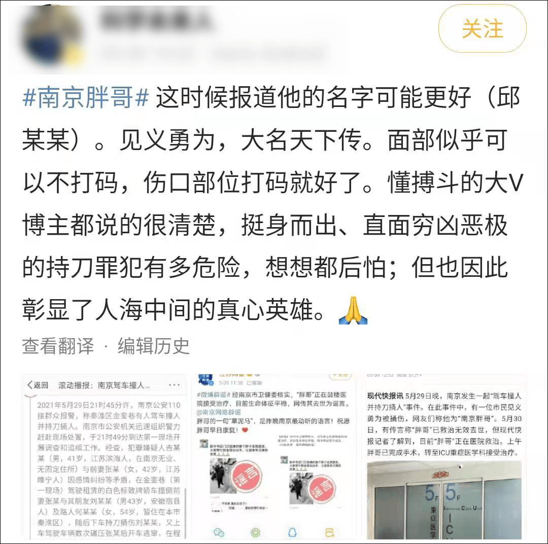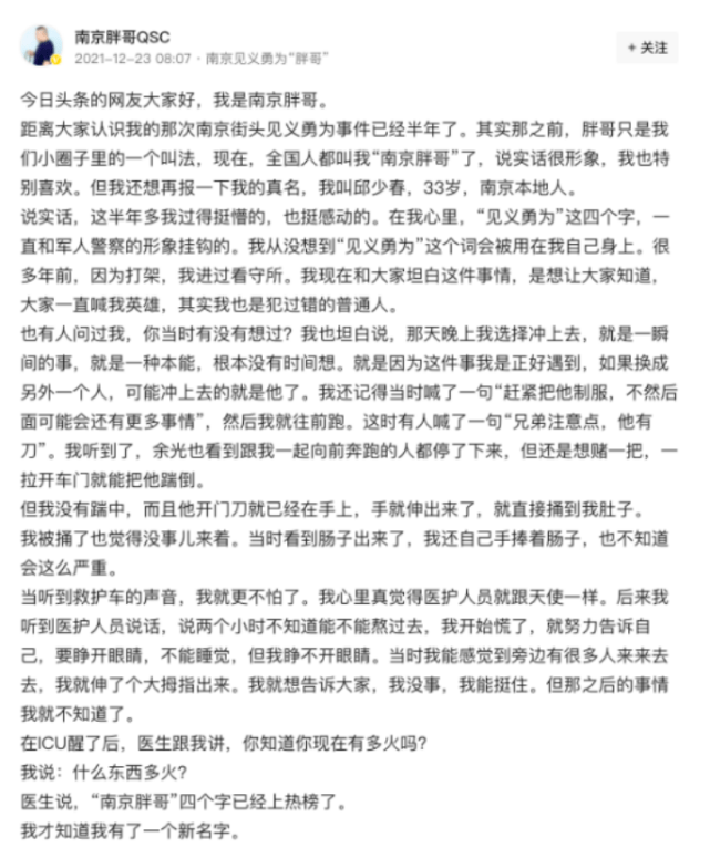 12月23日,南京胖哥发文回忆救人瞬间:我被捅了也觉得没事儿来着。当时看到肠子出来了,我还自己手捧着肠子,也不知道会这么严重。当听到救护车的声音,我就更不怕了。