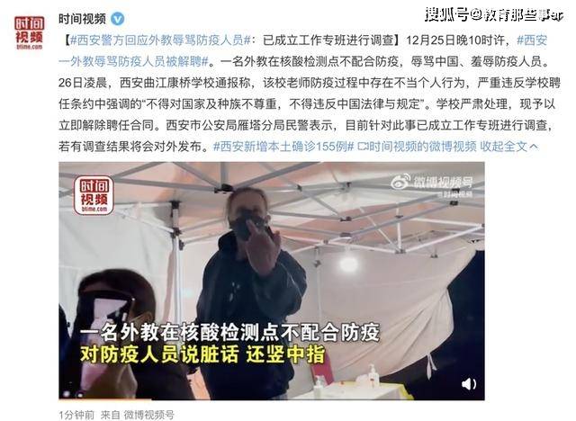 据央视新闻客户端消息,近日,西安一段外国人在国内核酸检测点谩骂防疫人员的视频在网上热传。据了解,该外国男子是西安一私立国际学校的外教。12月26日,该学校发表声明称,外教老师在防疫过程中的不当个人行为,严重违反学校聘任条约中所强调的“不得对国家及种族的不尊重,不得违反中国法律与规定”之条款,依照合约精神,学校严肃处理,现予以立即解除聘任合同。