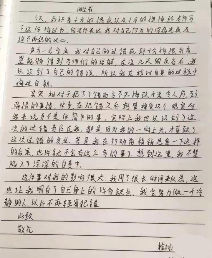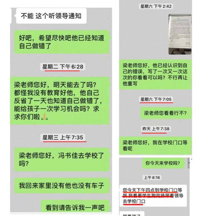 小田的行为违反学校规定,被勒令回家反省,岳女士带着儿子回到老家,小田写了悔过书,11月23号到29号,岳女士多次询问梁老师,儿子何时可以返校,毕竟孩子高三,犯错了给孩子一次机会,而连续几天,梁老师都回应,不能回,等通知。
