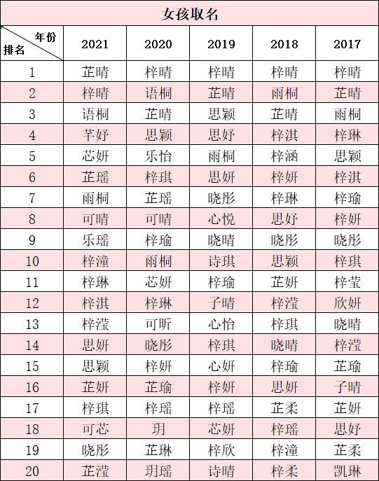 排名第2至10的女孩名字为 梓晴、语桐、芊妤、芯妍、芷瑶、雨桐、可晴、乐瑶、梓潼。女孩取名单字的前5名为 可、玥、悦、滢、果。