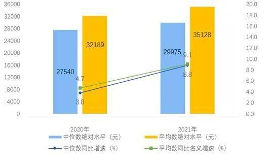 国家统计局数据显示,2021年全国居民人均可支配收入为35128元,扣除价格因素实际增长8.1%,居民收入增长与经济增长基本同步。全国居民人均可支配收入中位数29975元,增长8.8%,中位数是平均数的85.3%。