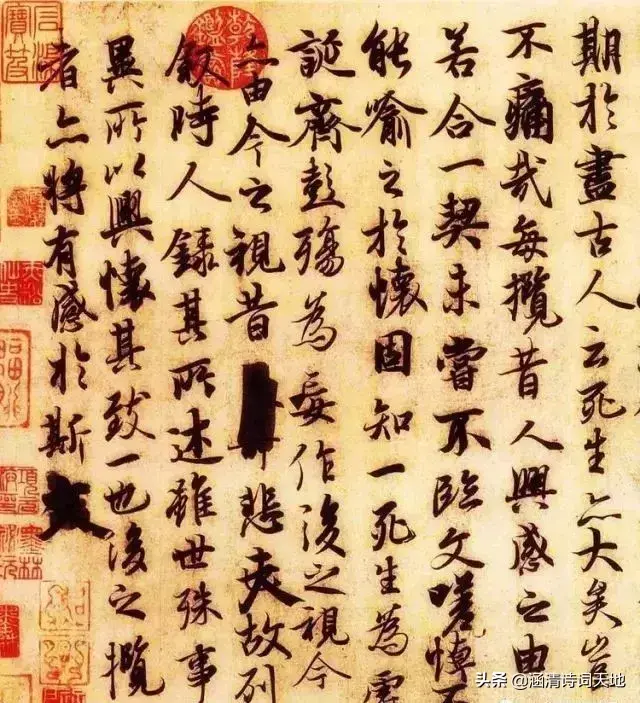 每览昔人兴感之由,若合一契,未尝不临文嗟悼,不能喻之于怀。固知一死生为虚诞,齐彭殇为妄作。后之视今,亦犹今之视昔,悲夫!故列叙时人,录其所述,虽世殊事异,所以兴怀,其致一也。后之览者,亦将有感于斯文。